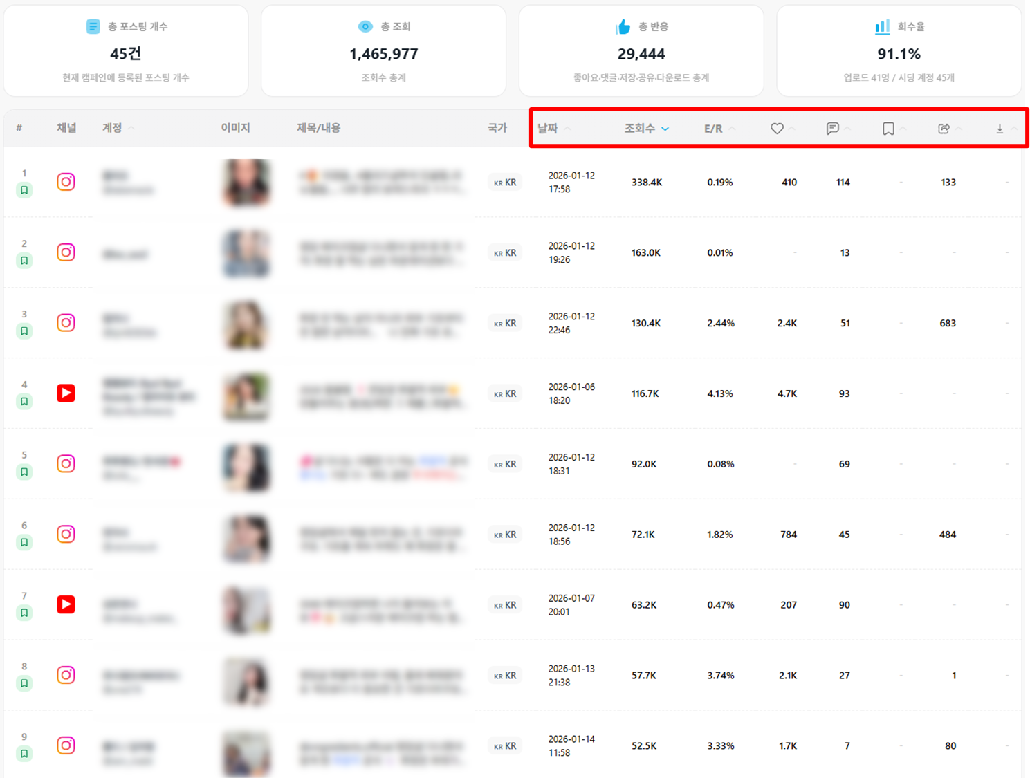 먼저, 정렬 기능을 활용해 조회수, 참여율(E/R) 기준으로 성과가 좋은 콘텐츠를 선별해보세요.