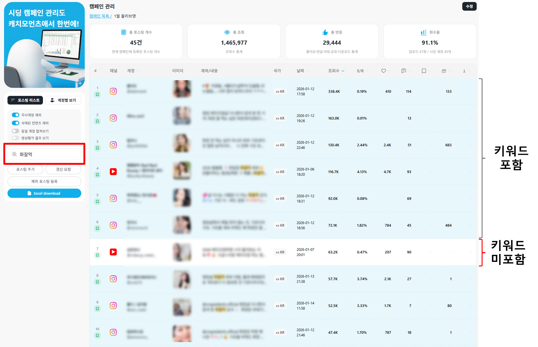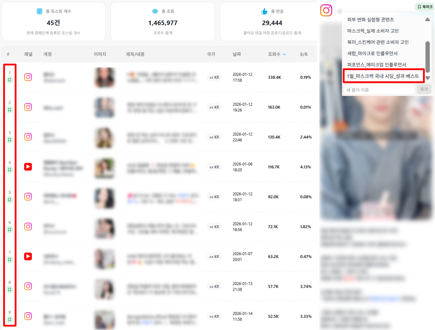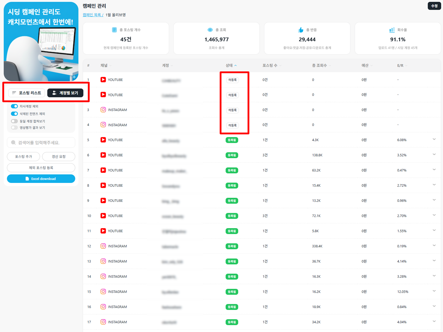 캠페인 관리 기능을 활용하시면 업로드한 인플루언서 계정을 기준으로