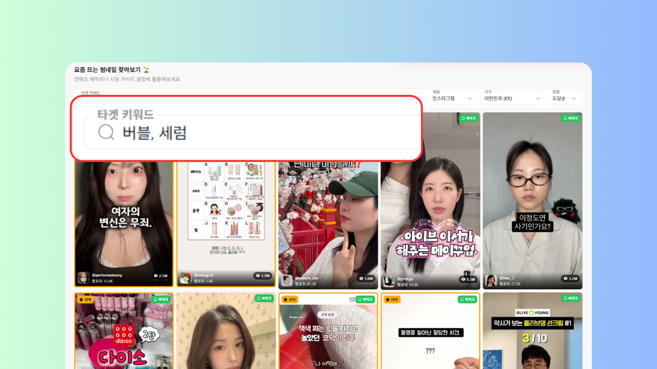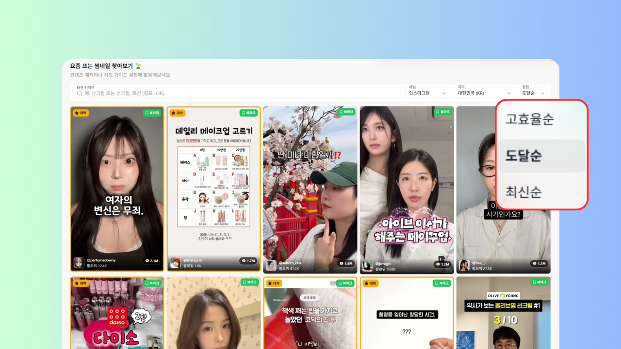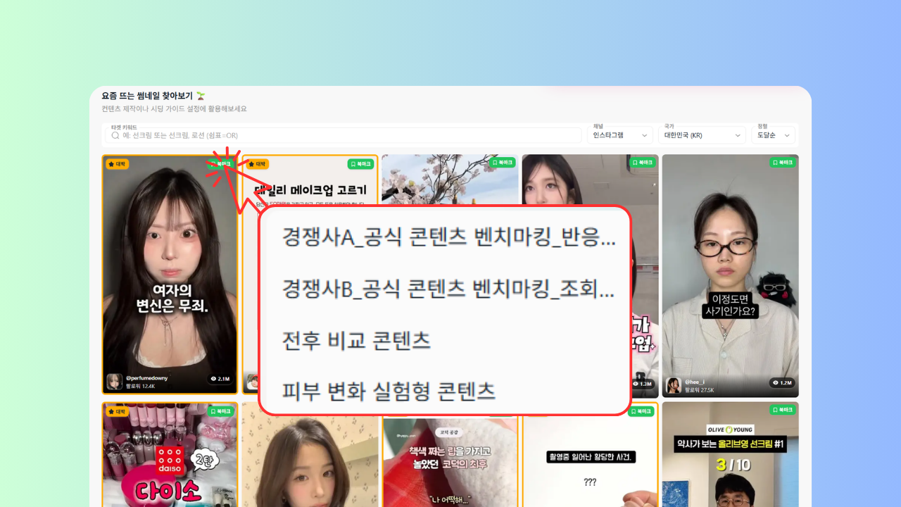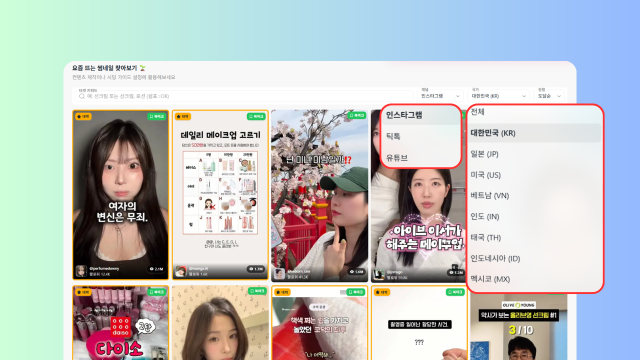 우리의 타겟 시장이 되는 국가와 인스타그램, 틱톡, 유튜브 등 다양한 채널에서최근 반응이 좋았던 썸네일만 한번에 모아서 확인할 수 있어요.