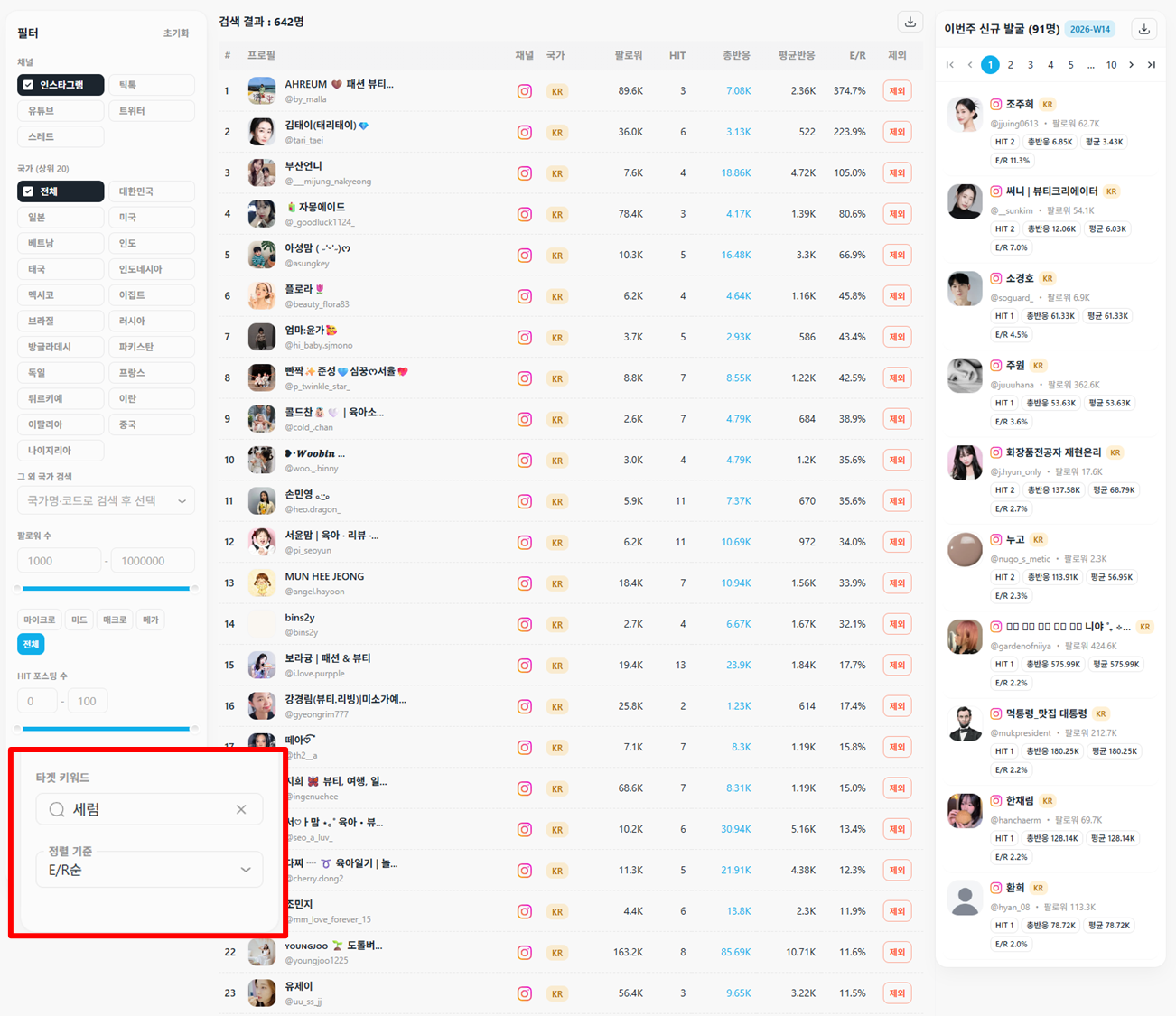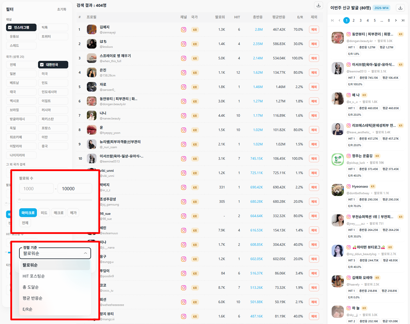 매주 주기적으로 유/무가 시딩을 진행하시면서 평균 이상의 성과를 내시는 브랜드사의 경우 인플루언서 발굴 기능을 크게 3가지 방식으로 Sorting 하여 활용하고 있으십니다.
