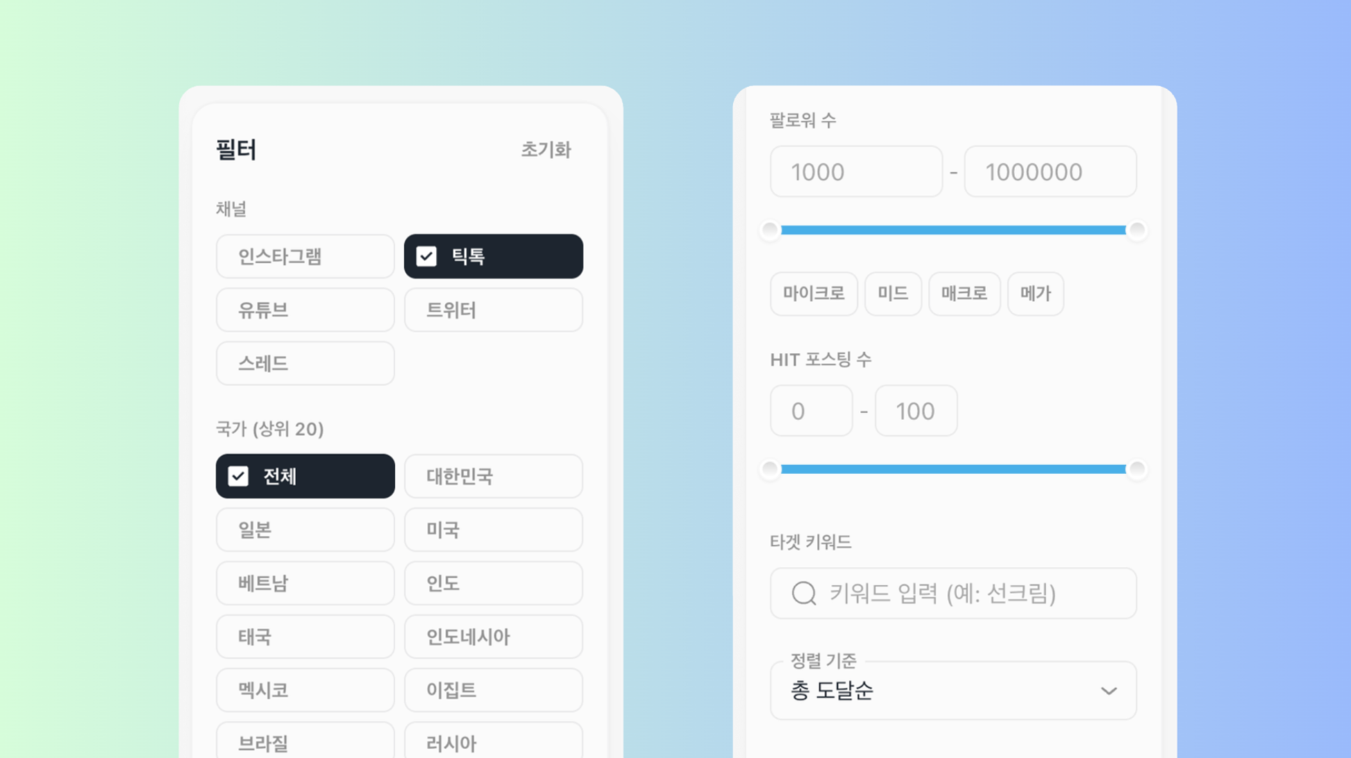 SNS 채널별, 국가별, 팔로워 규모별, 연관 키워드별 인플루언서를 찾아보실 수 있어요.