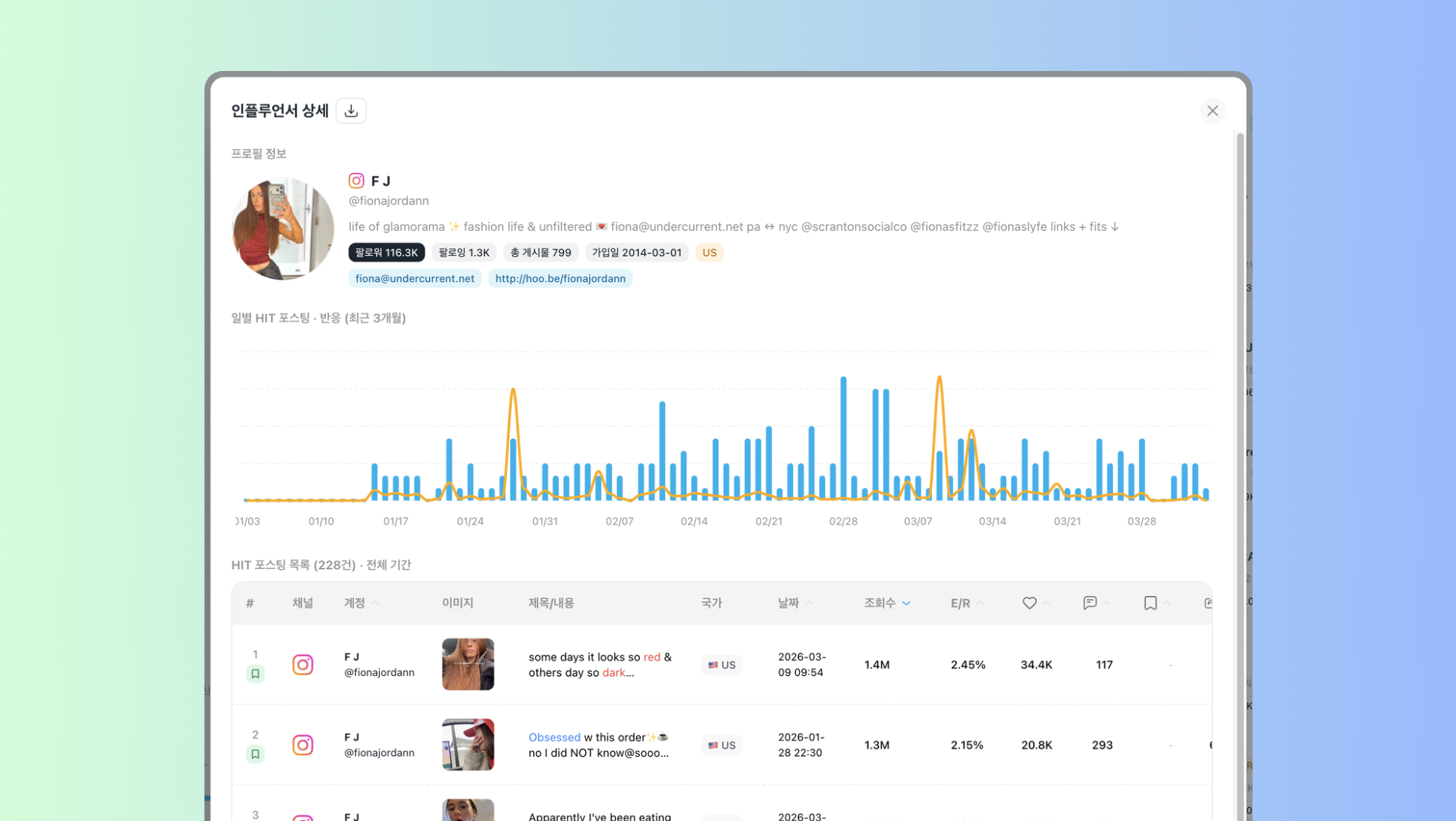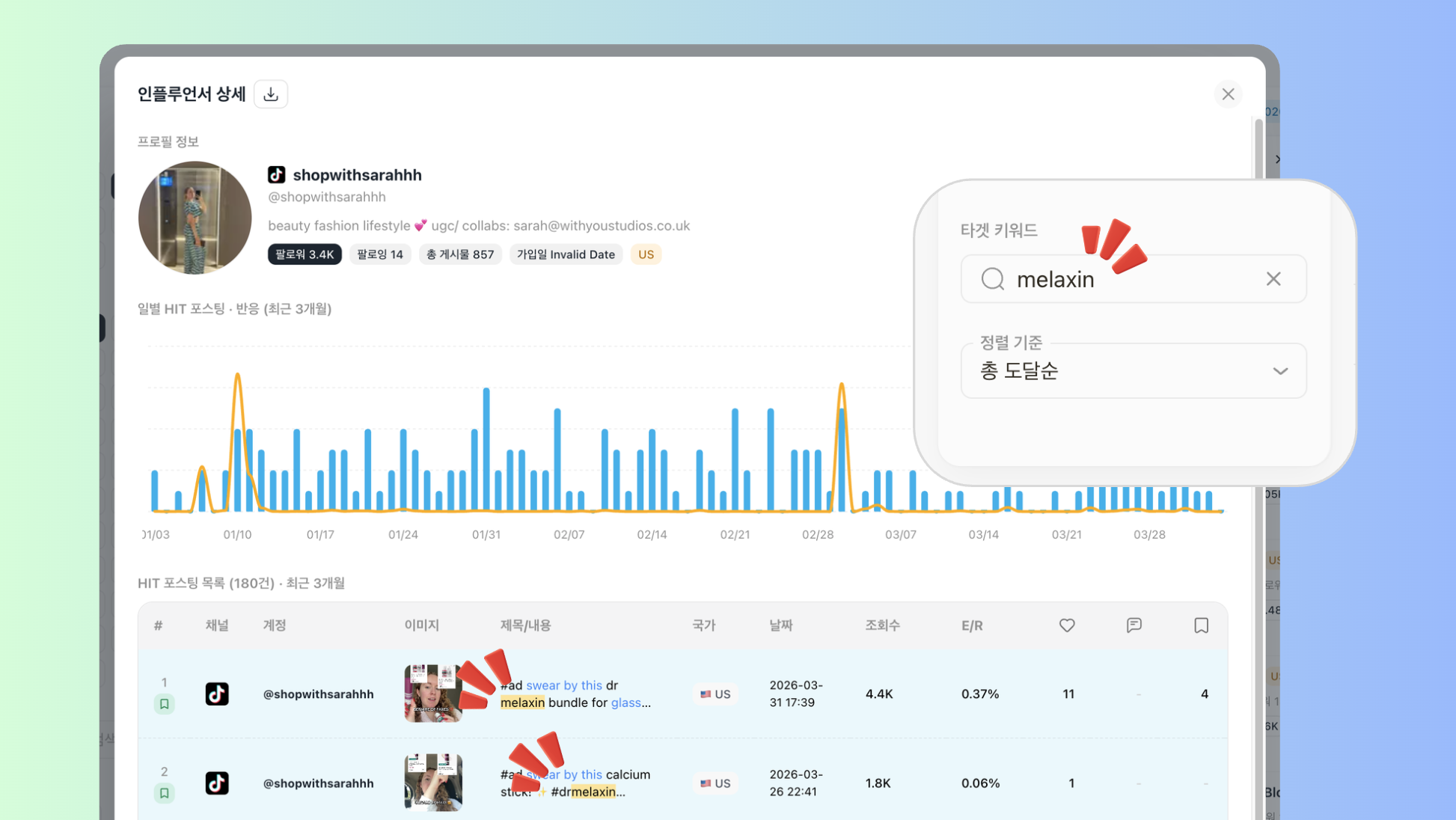 정렬 기준 : 팔로워, HIT포스팅, 총도달, 평균반응, E/R