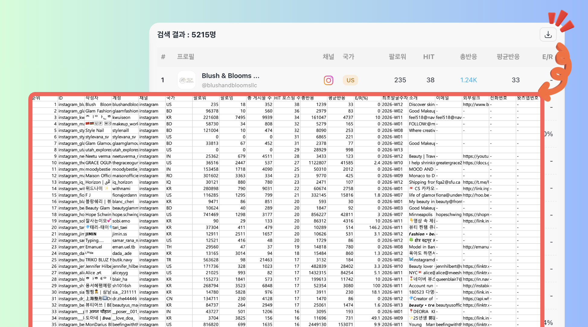 조회한 인플루언서 리스트는 엑셀로 다운받아 로컬에서 관리하시거나,