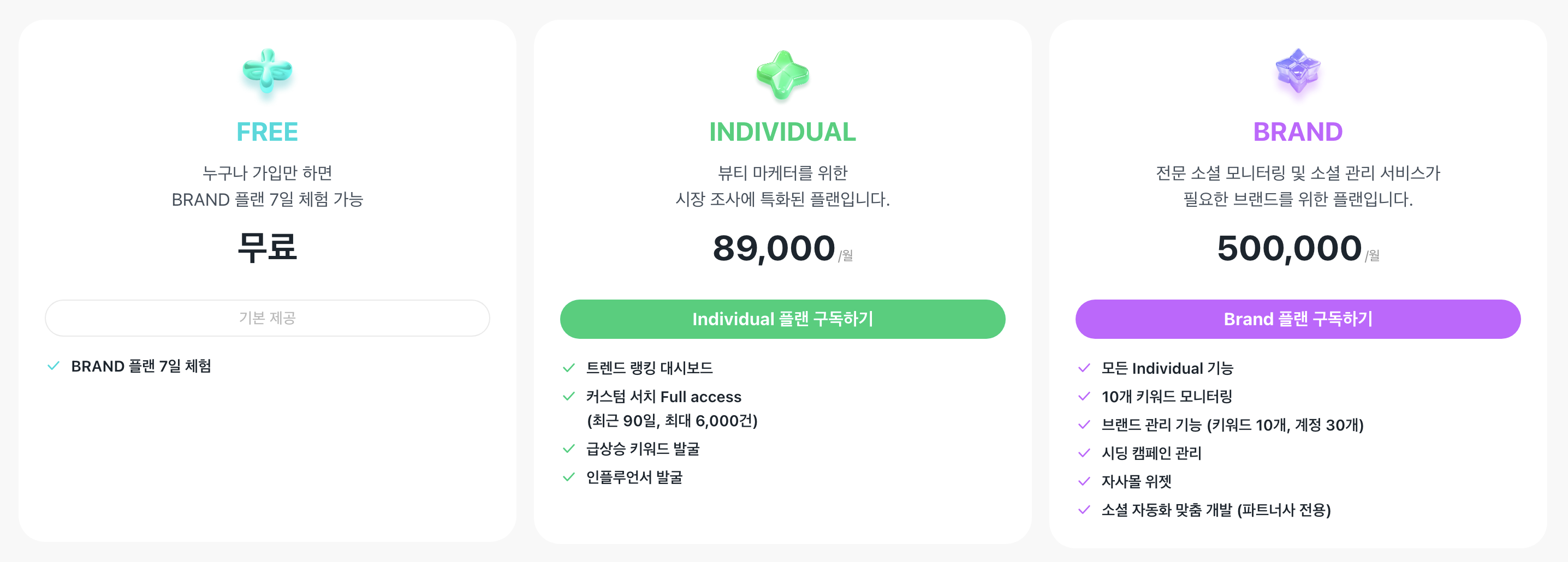 캐치모먼츠의 소셜 뷰티 DB를 월 89,000원에 무제한으로 찾아보실 수 있습니다.(Individual 플랜)
