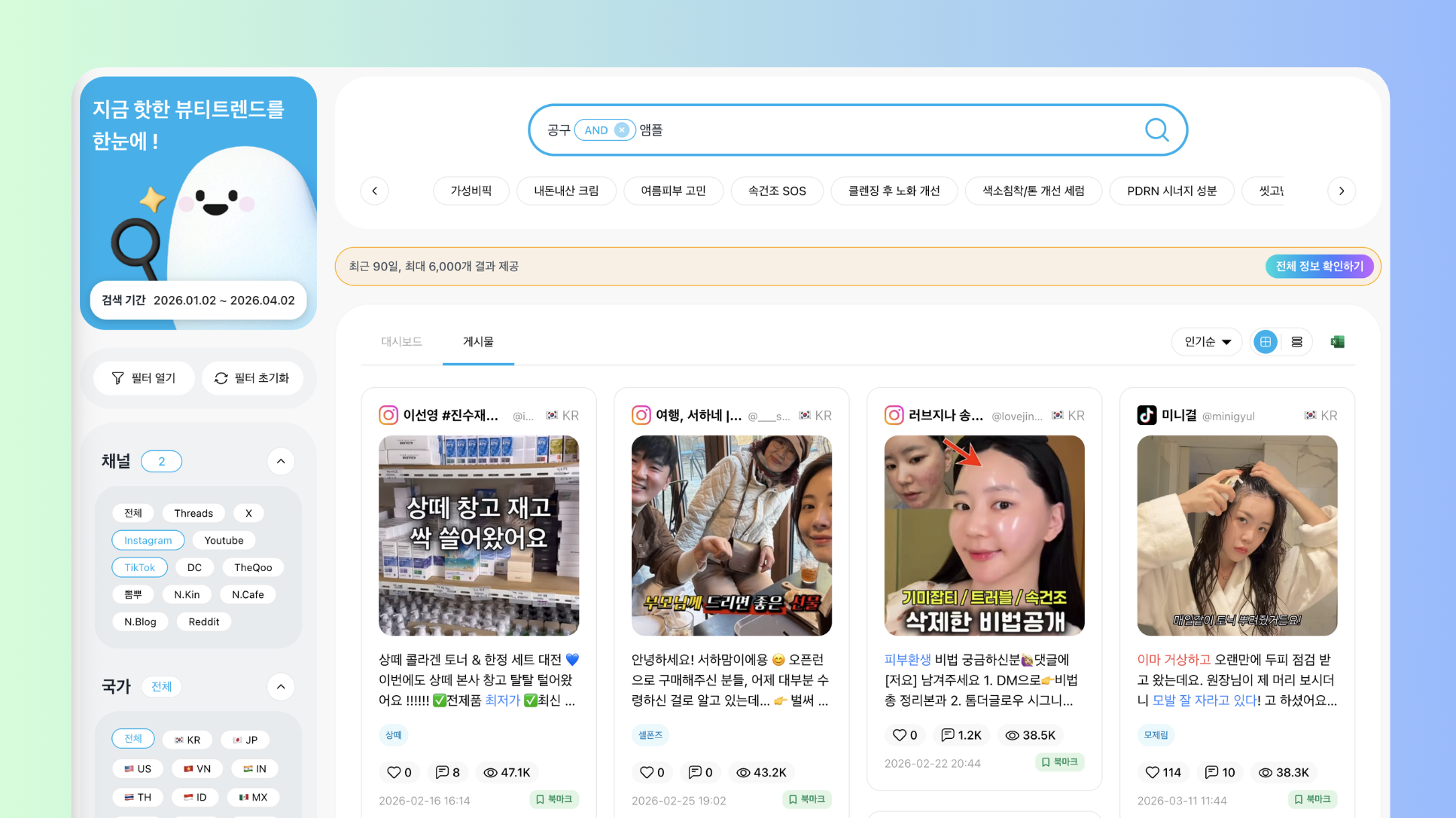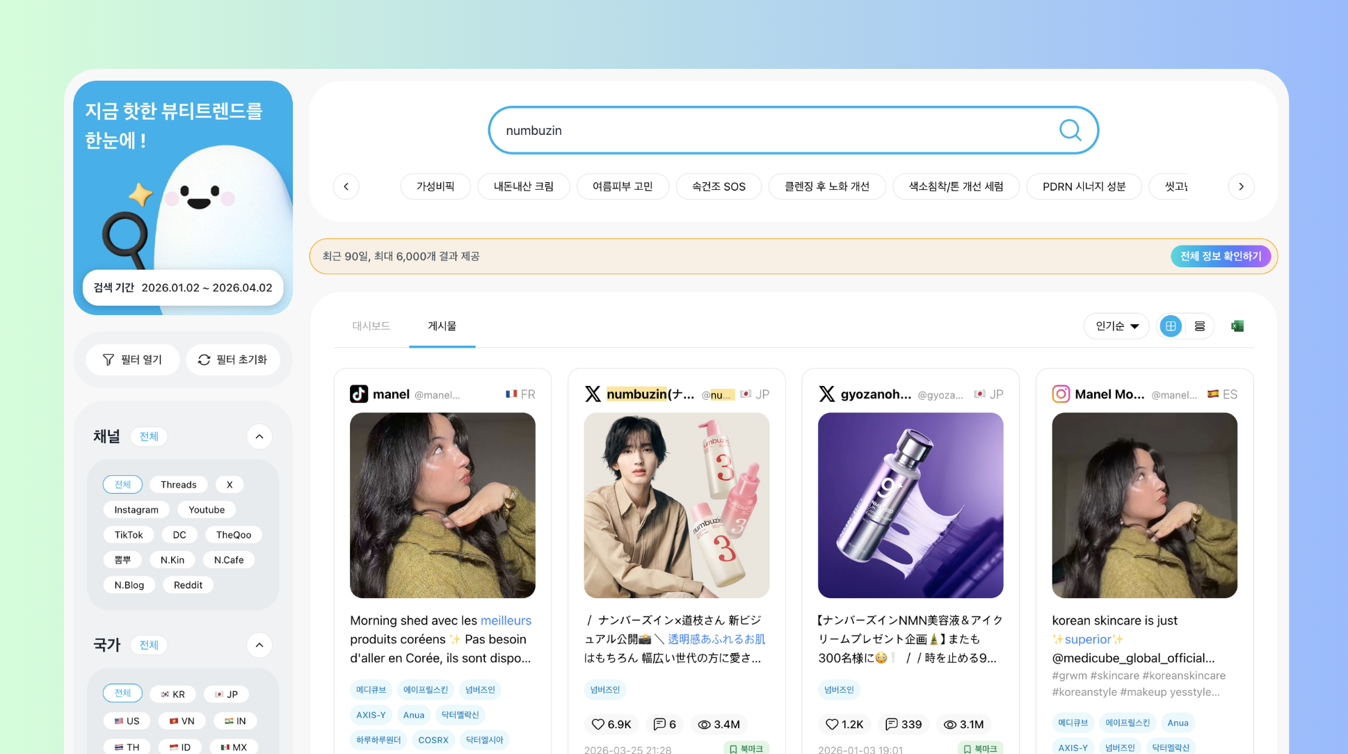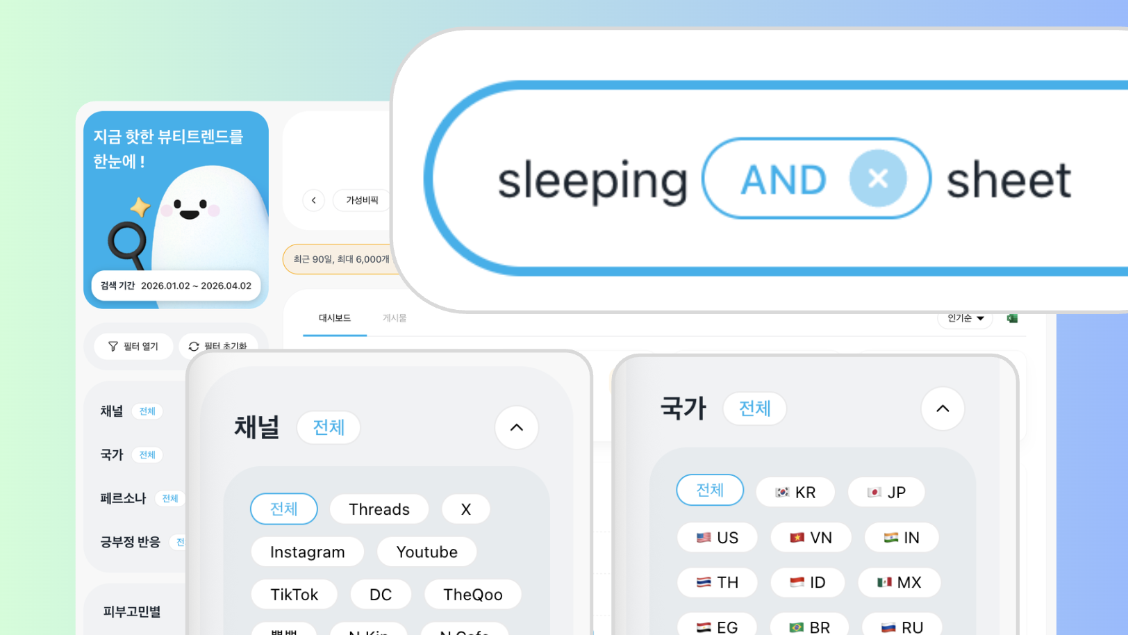 원하는 키워드를 입력하고, 채널/국가/페르소나 등의 필터를 통해