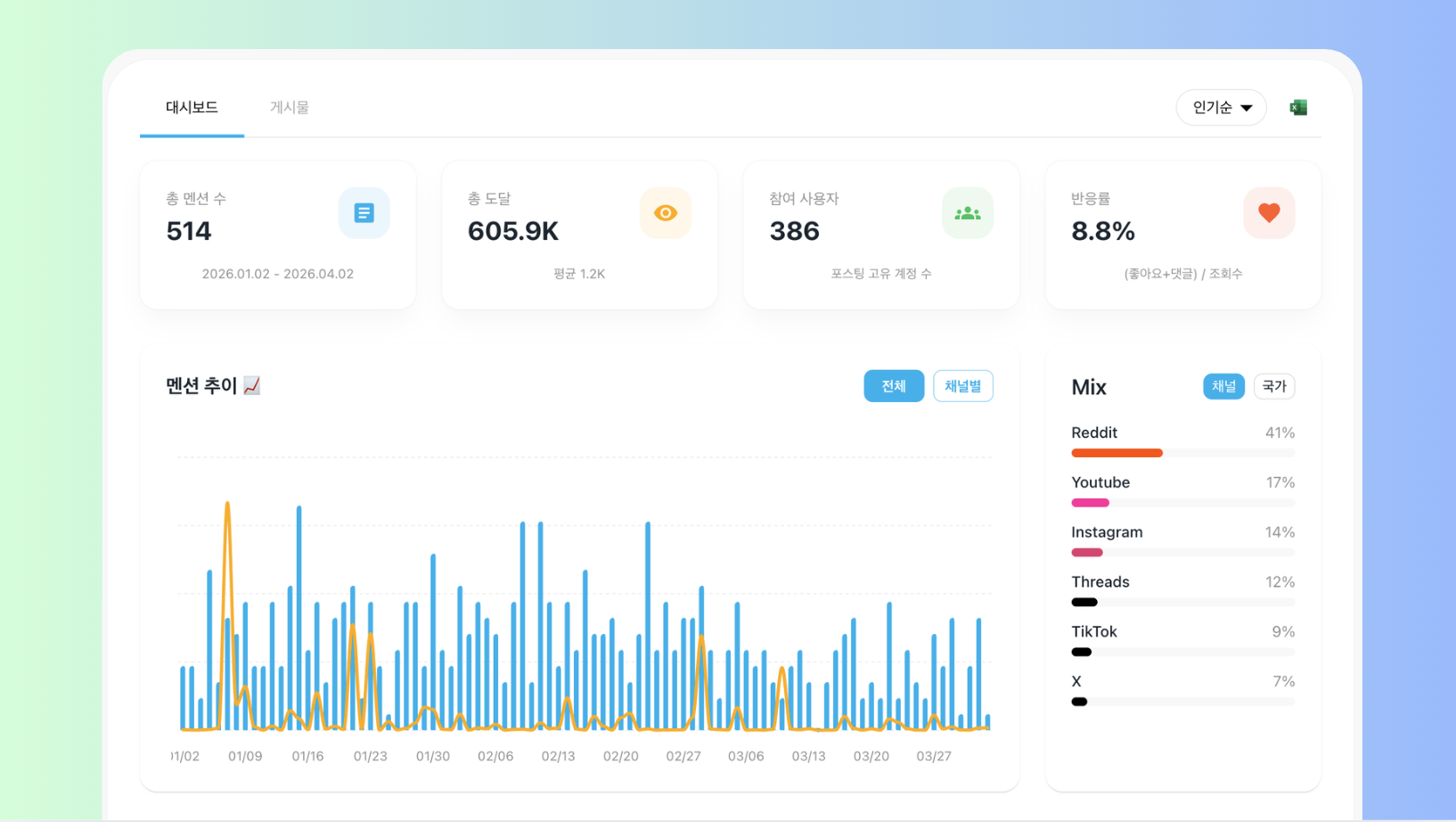 주요 지표들의 총 합산 수치와 일별 언급량/도달 트렌드, 채널/국가 mix를 확인하실 수 있어요.