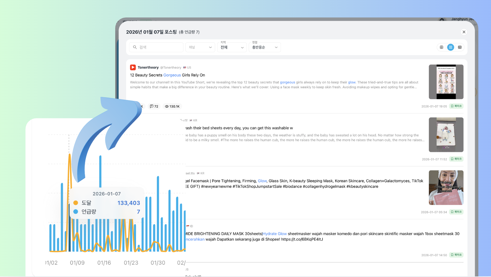 도달이 튀었던 날의 상세 정보가 궁금하다면? 그 날의 언급량 막대 그래프(파란색 막대)를 클릭해보세요! 아래와 같이 해당 일자의 실제 포스팅 리스트를 바로 확인하실 수 있어요.