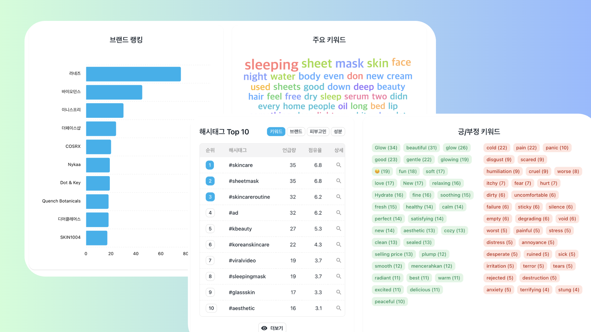 그렇게 모은 포스팅에서 가장 많이 언급된 브랜드부터, 많이 사용된 키워드, 해시태그, 긍/부정 키워드 정보까지 한번에 확인 가능하고, 상세 포스팅 리스트가 궁금한 경우 클릭해보시면 팝업으로 확인하실 수 있어요.