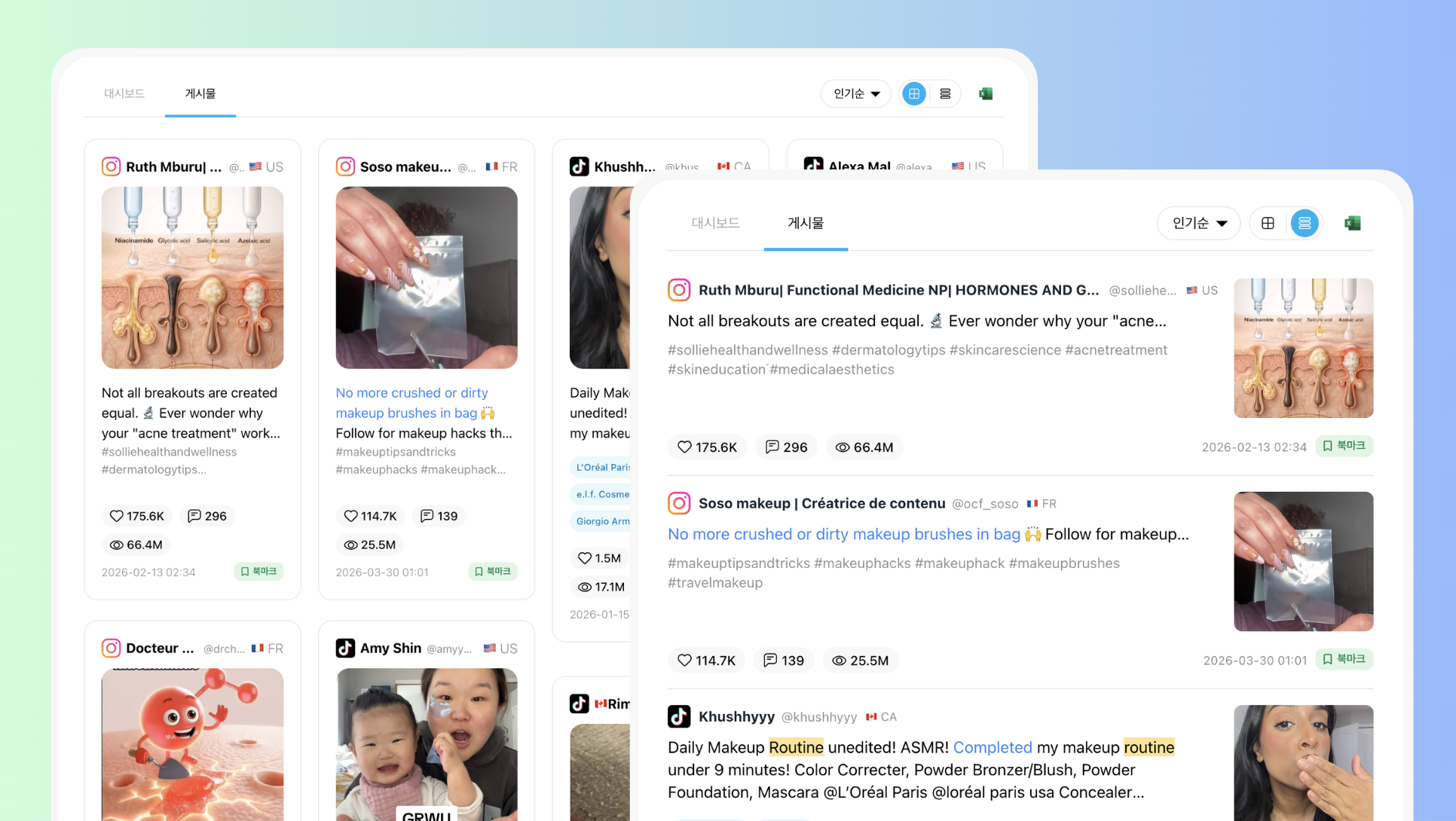 게시물 탭에서는 실제 포스팅을 인기순/최신순으로 확인하면서 어떤 썸네일이 뜨고 있는지, 어떤 크리에이터가 가장 인기가 많았는지 확인하실 수 있어요.