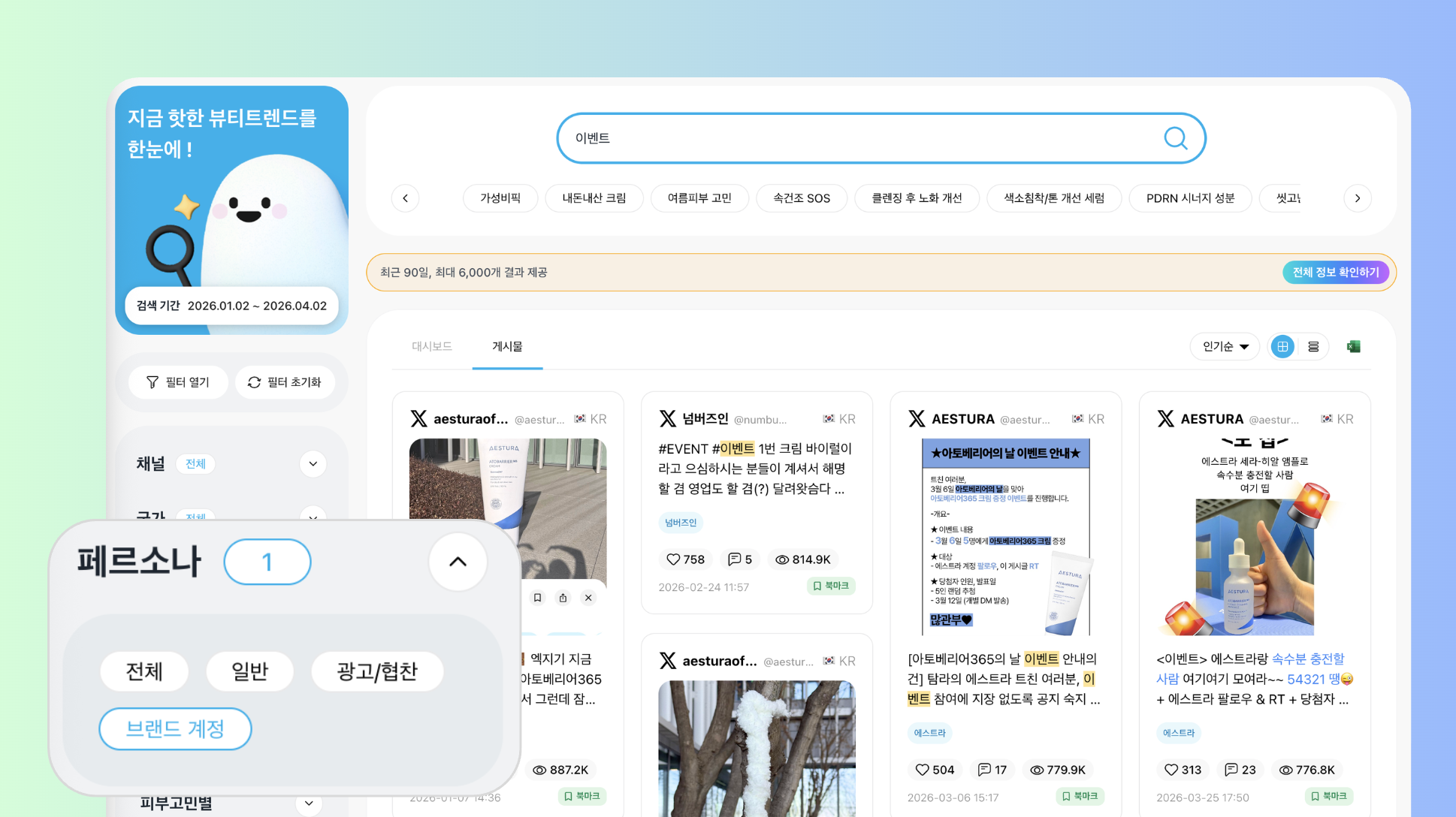 원하는 키워드를 입력하고, 좌측의 페르소나 > 브랜드 계정 필터를 통해 잘 운영하는 타사 브랜드 계정들의 활동을 살펴보세요!