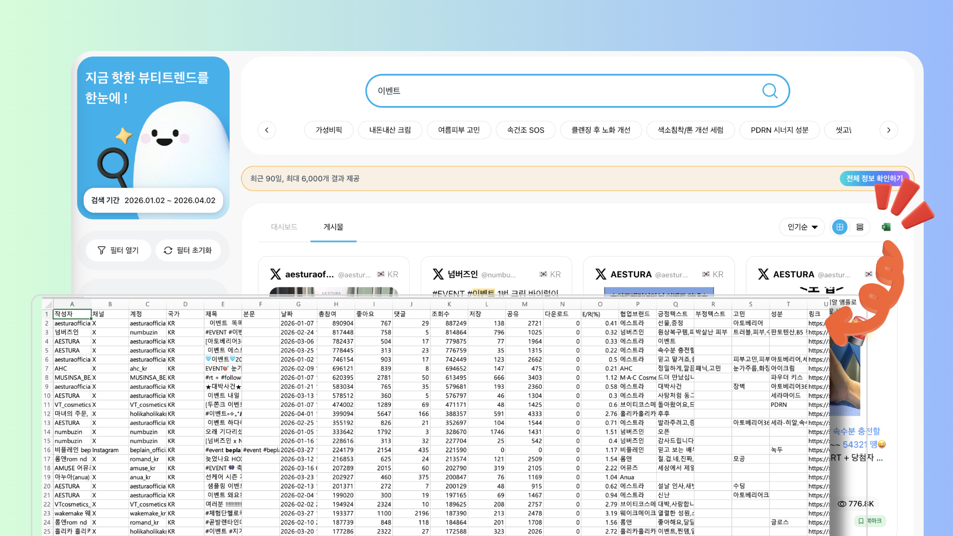 커스텀 서치에서는 최근 90일간의 데이터를 최대 6천개까지 한번의 검색으로 찾아보실 수 있어요. 원하는 키워드의 결과가 부족하다면, 브랜드 플랜을 통해 키워드를 등록하시고 해당 키워드 관련 포스팅 전체를 확인하실 수 있어요!