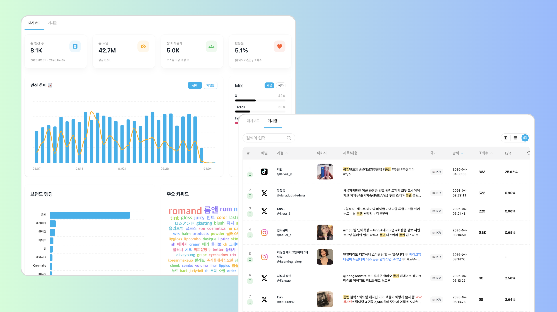 인기 포스팅 및 계정 랭킹