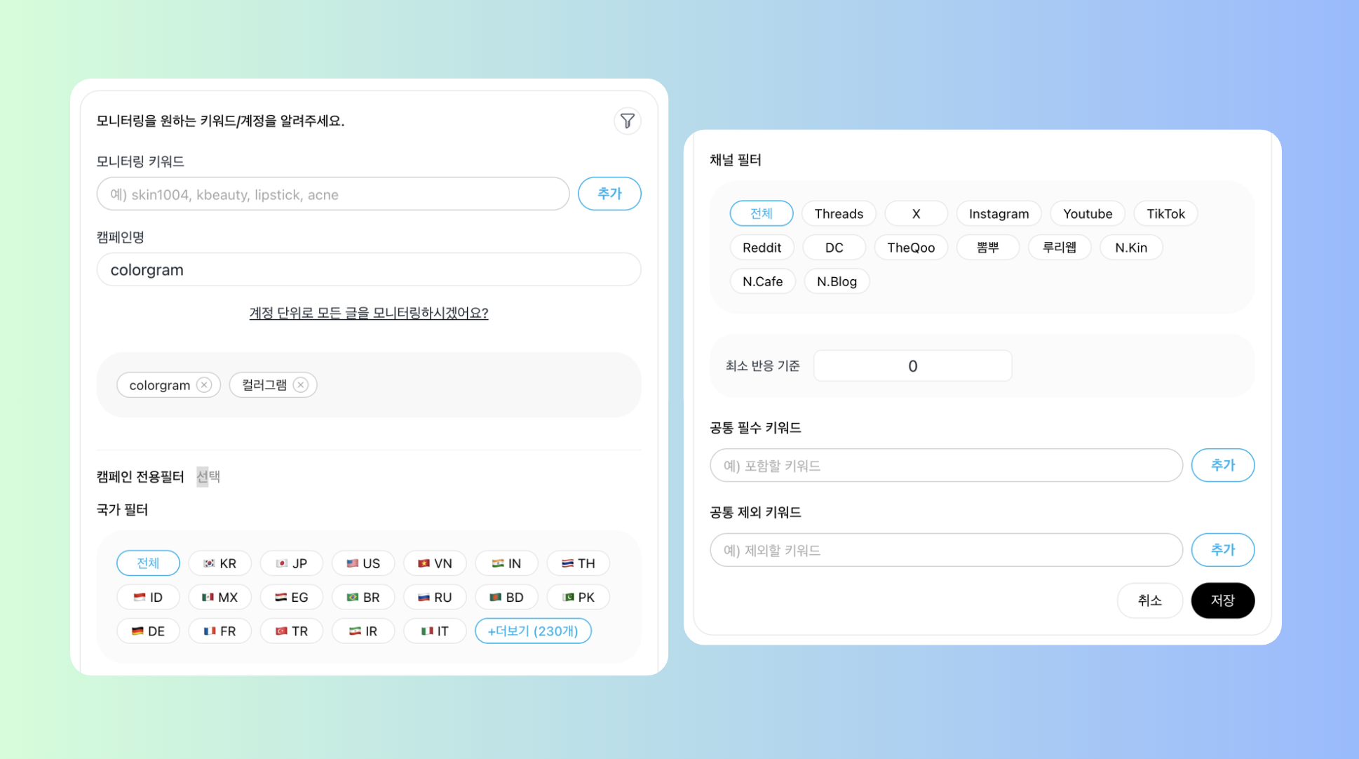 국가 필터 : 컨텐츠를 수집할 국가를 설정합니다.