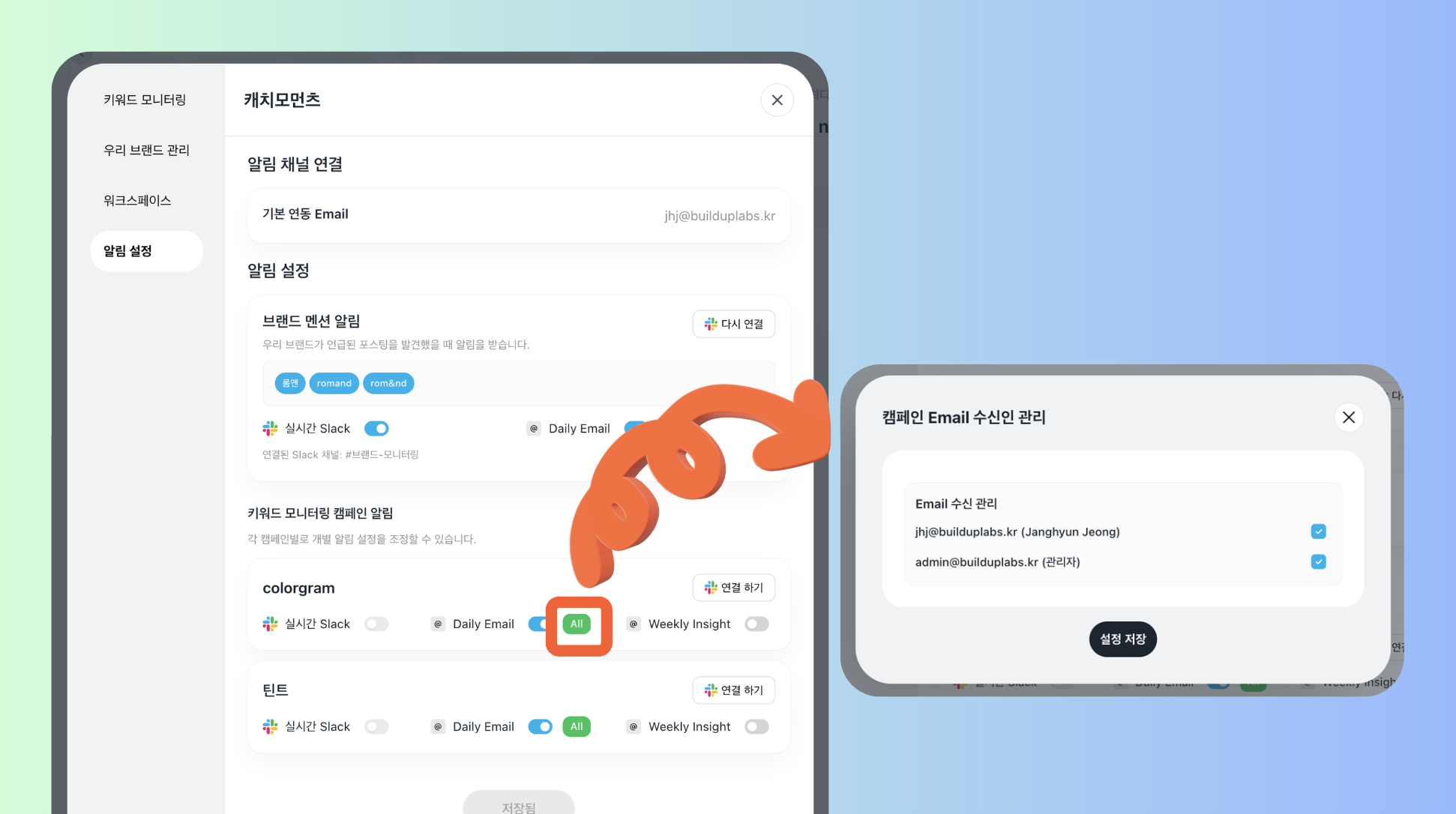 알림 설정 탭에서 키워드 모니터링 알림을 슬랙, 이메일로 연결할 수 있어요.